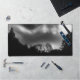 Black and white long exposure landscape photograph. Dramatic sky with snowy mountains and flowing river.