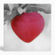 A creative and dramatic black and white photo of an apple tree branch with a bright red heart shaped apple hanging down. Artistic and striking composition and this red apple really pops against the subtle black and white background. Natures magic at work.