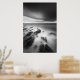 Long exposure photograph of an old rocky pier disappearing in wavy sea.