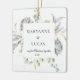 Silver floral and foliage with gold speckles on a white background with a custom script in the middle and a custom photo on the back. Check our store for more ornament options.