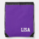 This drawstring backpack is shown in a purple color with a sample name.