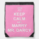 A rose drawstring backpack with the phrase "Keep Calm and Marry Mr. Darcy" printed in white.