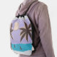 This drawstring backpack is designed with silhouetted palms and a lavender sky.