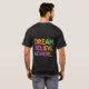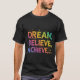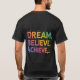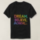 The t-shirt design features the text "Dream. Believe. Achieve.." in a gradient of vibrant colors, with abstract shapes and patterns surrounding it. The design is bold and eye-catching, and the colors are bright and cheerful. The text is written in a bold font, and the words are spaced out evenly. The design is centered on the chest of the t-shirt, and it is surrounded by a white border. The design is simple yet effective, and it is sure to catch the eye of anyone who sees it.
