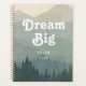 A trendy boho planner featuring a blue mountains and forest background overlaid with the editable headline "Dream Big" in white retro font . Personalize with your name and year.