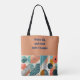 This tote bag design is special because it combines a modern geometric pattern with a vibrant yet balanced color palette of teal, orange, and navy. The muted orange background adds warmth and complements the bold shapes, while the motivational quote in navy provides both contrast and inspiration. Its clean, artistic esthetic makes it both stylish and meaningful, perfect for those who value creativity and positivity in their everyday items.