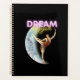 Fun and empowering design features vintage tinted photo cutout of ballet dancer, floral decorated crescent moon and "dream bigger" neon text on black background