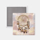 A dream-catcher design with a gold & brown trimmings that includes a round bamboo circle web of life with brown tones feathers and red beads on a soft feather background.
