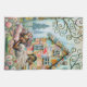 A young girl with colorful flowers in her hair is peacefully sleeping in front of a whimsical house made of various colorful paper scraps. Swirling trees and blooming flowers surround the scene, creating a dreamlike atmosphere. Digital Art