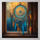 AI art depicting a dream catcher in a window outlooking beautiful Fall trees. Blue and orange beads and feathers.