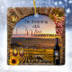 Wine themed Christmas ornament featuring a painting of a Roman arch with lantern and grapes overlooking a vineyard landscape at sunset. You can add your own (funny or other) texts.
