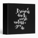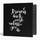 Inspirational binder displaying the phrase "Dreams don't work unless you do" in white brush script with an organic ink texture to achieve an authentic, hand lettered look.
