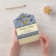 This all-in-one invitation with removable RSVP card is perfect for inspiring dreams and features a background of pale blue stripes in two shades and soft yellow stars. Layered on top of this pattern are panels of pale yellow with a black border to provide a base for sample text on the interior that can be customized for your event and blank space on the exterior that can be used for addressing the cards to the recipient and the returnable section with the appropriate return address. Finally a playful, space-themed mobile adorned with a crescent moon, shooting star, bright sun, rocket ship, and colorful planet hanging from arms with blue and purple zigzag details and a star right in the middle, sits on the flaps with a sample initial inside the sun to add a final custom touch. Be sure to check out the full Dreams of Space Mobile collection for more great gifts and products for a baby shower or the little one in your life.