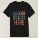 This t-shirt design features the message "Dreams Realize Here" in a bold, multicolored gradient. The American flag is subtly woven into the background, with its stripes providing a dynamic backdrop for the text.