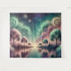 This ethereal design portrays a tranquil dreamscape where stylized trees with spiral canopies line a reflective waterway beneath a cosmic sky. Shades of teal, lavender, and rose blend seamlessly with soft clouds patterned in geometric swirls. The luminous horizon and celestial accents create a serene, surreal atmosphere that feels both futuristic and otherworldly.