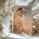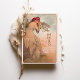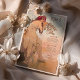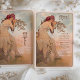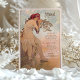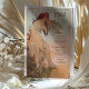 This exquisite Art Nouveau wedding menu card brings a serene, nature-inspired charm to your wedding. The design features a tranquil woman adorned with a crown of red blossoms, sitting peacefully by the water’s edge with flowing branches and soft foliage around her. The soothing color palette of soft blues, warm beiges, and muted greens enhances the dreamy, vintage atmosphere of this card, perfect for weddings with a natural or bohemian theme. The back of the card presents the menu in a refined layout, making it an elegant addition to your special day’s decor.