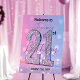 The design is nothing short of captivating. A shimmering “21” sparkles like diamond dust, radiating the excitement of this once-in-a-lifetime event. It rests against a dreamy gradient background blending soft pinks and calming blues—colors that feel like a warm embrace of celebration and joy. To add a personal touch, the name and message are scripted in an elegant combination of bold and cursive fonts, balancing modern charm with timeless sophistication. And here’s the best part: every piece of text is fully customizable, from the name to the date and even the message, so it fits perfectly into your unique vision.