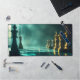 Elevate your workspace with this dreamy chess scene desk mat. Deep teal tones and luxurious glowing chess pieces create an inspiring and mysterious vibe."