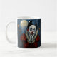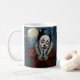 Melancholy clown illustration in red costume with moonlit night scene on ceramic mug, ideal for collectors, art lovers, and circus fans.