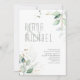 Delicate, nature inspired greenery arrangements including blue gum eucalyptus with splashes of gold and gold leaf outlines along with unique design layouts make this an exciting wedding set for any time of year. The wedding invitation shown here features lush foliage borders on the front face and a soft, watercolor texture on the back. View the collection link on this page to see all of the matching items in this beautiful design or search ID817 to see other pieces and color choices for this set.