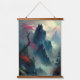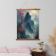 Beautiful majestic, dreamy, and misty mountain landscape with trees and river painting on a wood-topped wall tapestry.