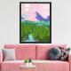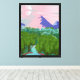 Bring a sense of calm and wonder into your space with this dreamy pastel landscape illustration. Soft pink skies glow behind distant mountains while a peaceful river winds through lush green forest, creating a serene, storybook-like scene.
