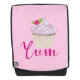 A backpack designed with an illustration of a yummy cupcake with pink swirls and a berry with leaves nestled in the frosting. "Yum" written in hot pink with a fancy trendy font. Set on a soft pink background.