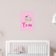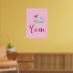 A poster with a yummy pink cupcake with scrumptious swirls of pink frosting with a yellow cupcake holder. A raspberry with stem and leaves on top. Dreamy and delicious. Text says Yum in a fancy trendy font. Set on a pastel pink backdrop.