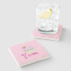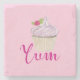 Stone coaster with a yummy pink cupcake with scrumptious swirls of pink frosting with a yellow cupcake holder. A raspberry with stem and leaves on top. Dreamy and delicious. Text says Yum in a fancy trendy font. Set on a pastel pink backdrop.
