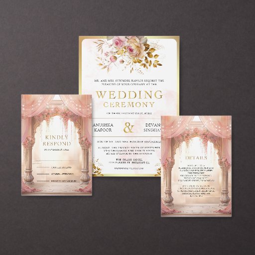 Amaze your guests with this elegant all in one Indian wedding invite featuring beautiful arches decorated with curtains and pink flowers. Modern gold typography with QR Code for online RSVP. Simply add your event details on this easy-to-use template and adorn this card with your favorite photo to make it a one-of-a-kind invitation.