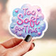Add a little softness to your day with this dreamy Too Soft For This sticker featuring pastel clouds, hearts, and sparkles. Perfect for laptops, planners, water bottles, phone cases, or journals. Printed on high-quality vinyl with a glossy, long-lasting finish. A sweet and gentle vibe for those who feel all the feels. Makes a perfect small gift or a little treat for yourself.