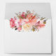 This stylish envelope features a bouquet of mixed flowers in peach, pink, salmon, coral, pale lavender and ivory white with trailing greenery that spreads over the top border of the envelope on both the front and back sides. The bouquet is repeated on the inside of the envelope. A sample return address template is included on the back envelope flap that you can edit with your desired address.
