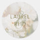 Add a romantic finishing touch to your wedding stationery with this elegant round sticker design. Featuring a dreamy white rose flower photo by Destei faded under a white overlay, the design highlights your names and wedding date in lovely typography. A subtle ampersand behind the names adds an extra layer of charm. Perfect for sealing envelopes, favor packaging or adding a floral detail to your wedding decor.