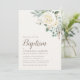 Baptism invitations featuring dreamy white winter floral and leaves.