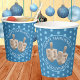 Create your own unique and special party supplies like these cute personalized Hanukkah paper cups printed with blue polka dots and a rustic oak dreidels design. Text in a simple white font curves above and below the central dreidel images and you can edit that text to add your name, the year, etc. These custom Chanukah paper cups are sure to be a delight at both a children's party and a gathering of adults and will help make clean up a breeze. Add a custom touch to your Festival of Lights celebrations with personalized custom party supplies for Hanukkah like these cute little paper cups.