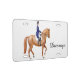 Original fine art design of a Dressage horse and rider by equine artist Carolyn McFann of Two Purring Cats Studio printed on a quality and customizable license plate cover for equestrian sport fans.