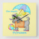 Let this dog tell time with this whimsy wall clock featuring dog art and a customized name or dog name. Great gift idea. This cute grey (gray) dog is ready for fun time at the beach with a colorful beach ball and a turquoise and lavender beach umbrella. Wearing cool yellow sunglasses, fuchsia and turquoise flip flops, orange beach tee shirt and a purple and green beach hat, she's ready to go, dressed in style. The background is yellow. Fully customizable for a name to personalize and customizable words "The Beach" can be changed to other words of your choice. The sun is out and shinning for a perfect day and she or he is ready for you to toss the ball. The dog breed fits with terrior or other small grey dogs with medium to long hair. This design is cute for all dog lovers and is original art by artist and fabric designer Phyllis Dobbs. Fully customizable.