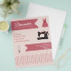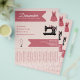 A dressmaker flyer with tear off strips and illustration of a sewing machine, a sewing mannequin, and a dress with sewing pins on a light pink background. Perfect for activities such as dressmaker, alterations, repairs, fashion designer, tailor, handmade sewing, etc.