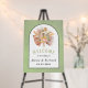 Tropical dried palm leaves, pampas grass and protea flowers sage green arch wedding welcome foam board. This lovely wedding design features an arch frame on green stained background. In the frame there is a bouquet of dried palm leaves, protea flowers and pampas grass.