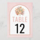 Floral arch with tropical dried palm leaves, pampas grass and protea flowers wedding table number card. This lovely wedding design features an arch frame on soft pink stained background. In the frame there is a bouquet of dried palm leaves, protea flowers and pampas grass.