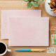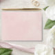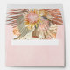 Soft pink fall wedding envelope with tropical dried palm leaves, pampas grass, and protea flowers. On the outside of this lovely wedding design, there is a soft blush pink stained background. A bouquet of dried palm leaves, protea flowers, and pampas grass adorns the inside.