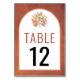 Tropical dried palm leaves, pampas grass and protea flowers terracotta arch wedding table number. This lovely wedding design features an arch frame on terracotta stained background. In the frame there is a bouquet of dried palm leaves, protea flowers and pampas grass.