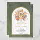 Tropical dried palm leaves, pampas grass and protea flowers real gold foil arch sage green wedding invitation. This lovely wedding design features a gold foil arch frame on green stained background. In the frame there is a bouquet of dried palm leaves, protea flowers and pampas grass.