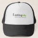 Hat with logo on white background with black details.