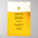 Drink Beers and Party On Beer Poster Print. A beer joke poster with a glass pint of beer and fully customizable text slogan "Drink Beers and Party On" against a beer background. This great beer parody poster print is fully customizable, add your texts and images! A great beer gift for the big beers fan!