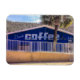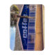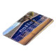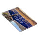 Drink COFFEE sleep later - In worn white letters on a cobalt blue background painted on a brick wall, the sign in the original photograph by ZoeSPEAK on this Magnet says it all to coffee lovers. The little shop near the beach, with a palm tree in front and a thatched roof behind, is basking in the afternoon sunlight.