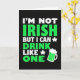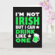 This card opens on a deep black background with a big, easy-to-read message across the center that says, “I’M NOT IRISH BUT I CAN DRINK LIKE ONE.” Most of the lettering is bright white, while “IRISH,” “DRINK,” and “ONE” pop in a shamrock green 💚, like a friendly wink shared across the bar. The words are stacked in neat lines, filling most of the front so the joke lands right away. Tiny white star shapes sprinkle around the text, adding little sparks that feel like laughter in the air. In the bottom-right corner, a green beer mug leans in as if joining the conversation, making the scene feel like a toast between close friends ☘️. The mug matches the green words, tying the layout together and keeping your eye moving from the punchline down to the illustration. A thick cap of white foam spills over the top of the mug, with a few crisp starbursts nearby against the black field.