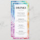 Introducing the slim drink menu card from the "Ethereal Bloom Collection," a vibrant and artistic addition to your wedding reception. At the top of the card, against a backdrop of mesmerizing alcohol ink artwork with swirling hues of blues, purples, reds, oranges, and greens, the caption "Drinks" is elegantly displayed. The couple's names and the wedding date are featured prominently, adding a personal touch to the design.