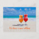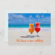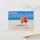 Two drinks on beach sand new address announcement postcards. Affordable and fun way to tell everyone you have moved to the beach! Tropical frosty drinks in stemware with straws sit on sand with a turquoise sea in the background. "We have a new address" wording at the bottom can be changed. On the reverse include names and new address information. Each recipient's address can be added one by one, or remove the sample text and hand-write addresses afterwards.