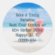 Round return address envelope seals with drinks on the beach image. Anyone living a casual, seaside lifestyle will love this sticker. Frosty cocktails sit on a sunny beach with tropical blue water in the distance. This is the background image for your name and address which is printed in chunky, handwritten style. Other sticker shapes may work depending on your text. Don’t let any wording get near the edge.